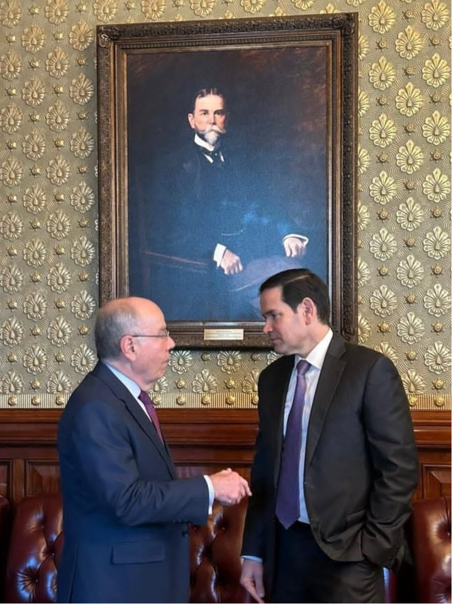 Na foto divulgada pelo Ministério das Relações Exteriores do Brasil na última quinta-feira (dia 16), Vieira e Rubio aparecem conversando. O brasileiro parece estar dizendo algo e gesticulando, enquanto Rubio escuta, com uma das mãos nos bolsos. No quadro que aparece atrás deles está John Milton Hay, o 37º secretário de estado americano. De acordo com o site www.diplomaticrooms.state.gov, o óleo sobre tela, que foi adquirido pelo governo americano junto à família do diplomata em 1906, um ano após a sua morte, fica numa das salas para encontros cerimoniais na sede da diplomacia dos Estados Unidos. >