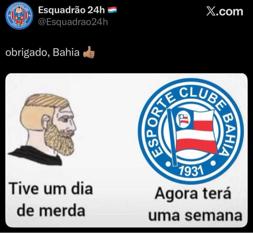É o Esquadrão, não tem jeito. E, mesmo de coração partido, trazemos o meme desta semana sobre o nosso querido Bahia. Claro que o Flamengo também se deu mal, mas deixemos a zoação aí por conta dos cariocas. Por aqui fica a expectativa do nosso Baêa na próxima Libertadores.>