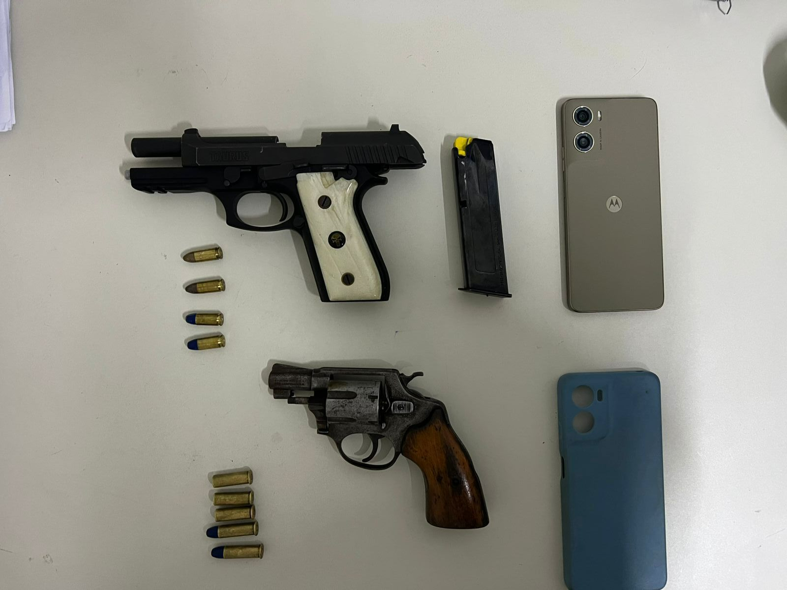 Com os criminosos, um deles já condenado por homicídio, foram apreendidos uma pistola, um revólver, munições, carregadores e porções de drogas. Todo o material foi apresentado na delegacia, e o policiamento na região de Portão segue reforçado.>