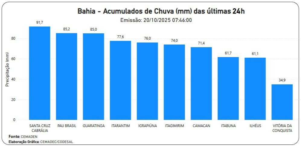 Outras cidades do sul baiano também tiveram altos índices de chuva. São elas: Pau Brasil (85,2 mm), Guaratinga (85 mm), Itarantim (77,6 mm), Igrapiúna (76 mm), Itagimirim (74 mm) e Camacan (71,4 mm). Os menores acumulados entre as dez primeiras posições foram observados em Itabuna (61,7 mm), Ilhéus (61,1 mm) e Vitória da Conquista (34,9 mm).>