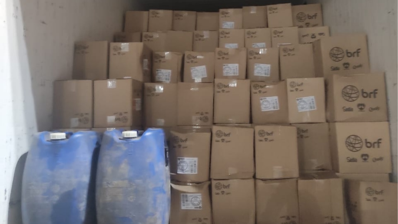 Por volta das 22h00, policiais abordaram um caminhão VW/11.180 DRC, conduzido por um homem de 43 anos. Os policiais constataram que a carga de 6.100 quilos de linguiça estava sem a documentação fiscal.>