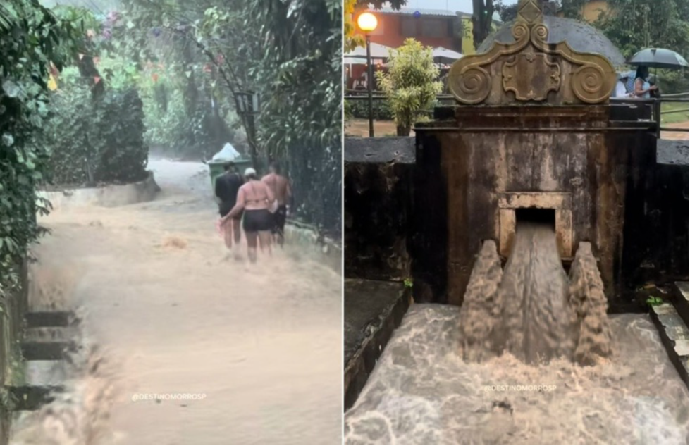 Uma das cenas que mais repercutiram nas redes sociais foi a de uma rua íngreme do distrito transformada em uma espécie de “cachoeira”, com a água descendo em grande volume e velocidade.>
