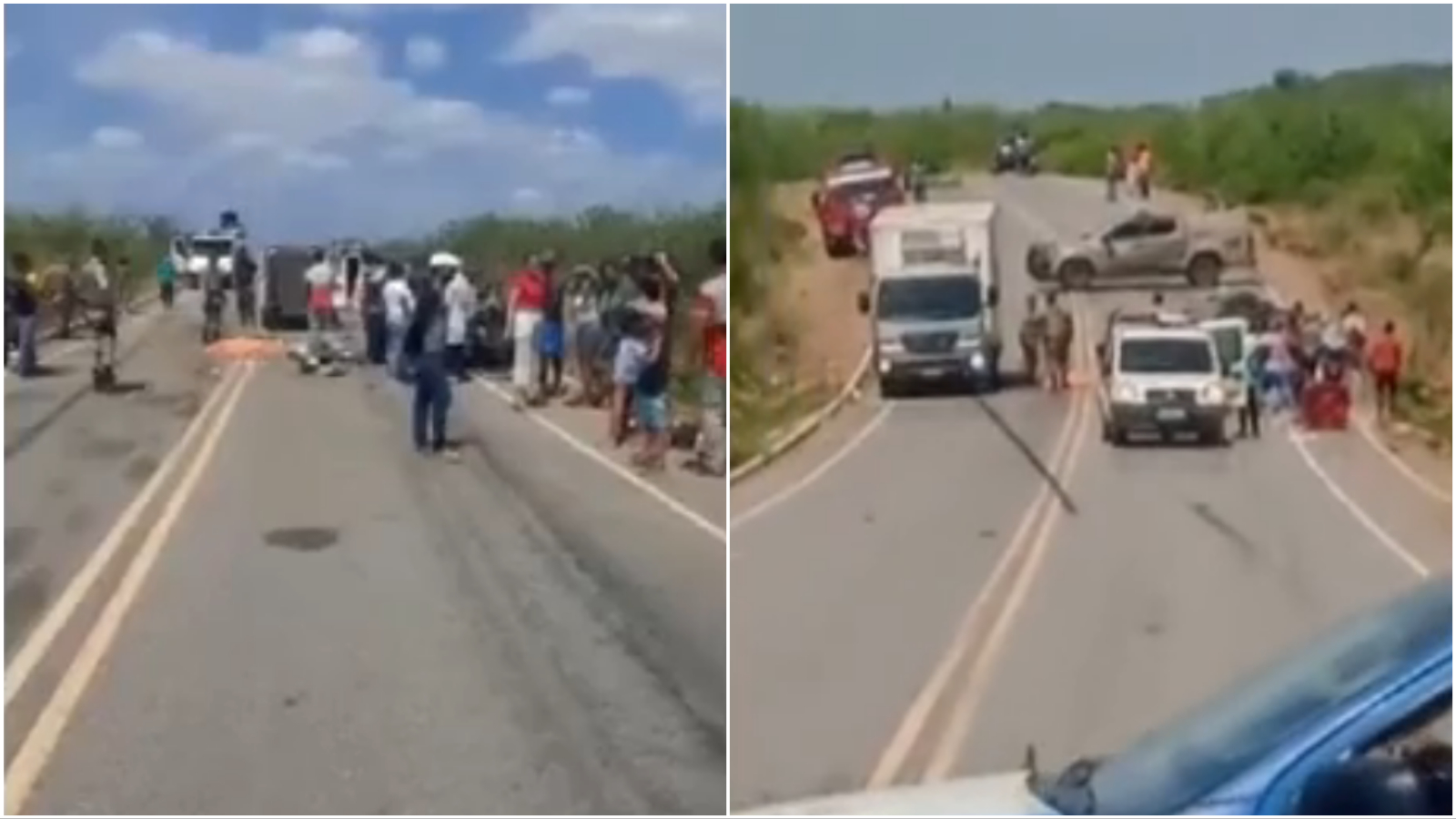 Quatro pessoas morreram, sendo uma mulher e três policiais militares, em um acidente de trânsito na manhã desta quarta-feira (8), na BA-210, próximo ao município de Curaçá, no norte da Bahia.>