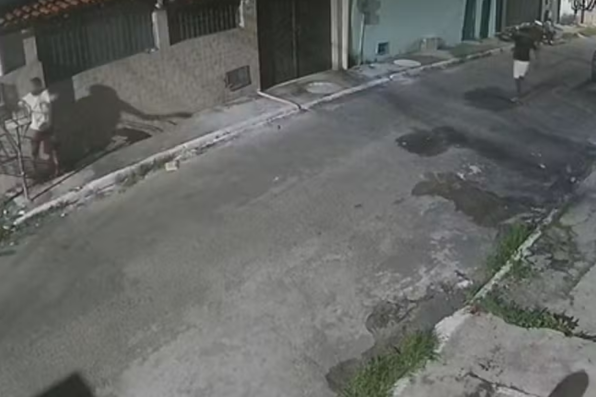 As imagens, que passaram a circular nas redes sociais no dia seguinte, mostram o momento em que um homem armado se aproxima do grupo. Ao perceberem a ameaça, as vítimas tentam escapar correndo, mas são alcançadas pelos disparos. A gravação também revela a presença de um quarto homem, que aparece com uma mochila semelhante às utilizadas por entregadores. Ele tenta deixar o local mancando.>