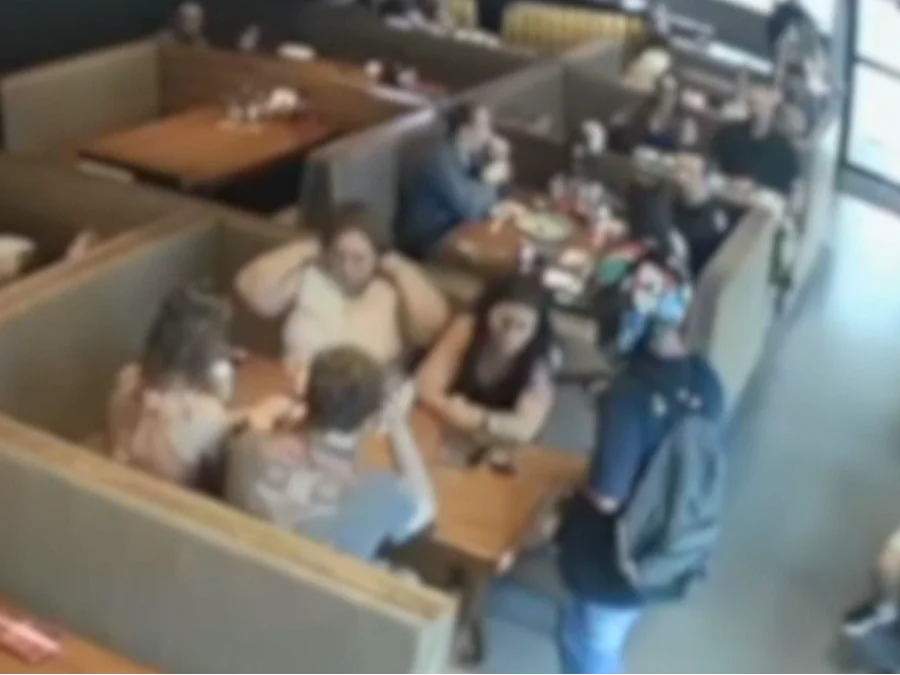 Outro criminoso aparece mantendo parte das vítimas sob ameaça em outra área do restaurante. Os clientes foram obrigados a se deitar no chão durante o assalto.>