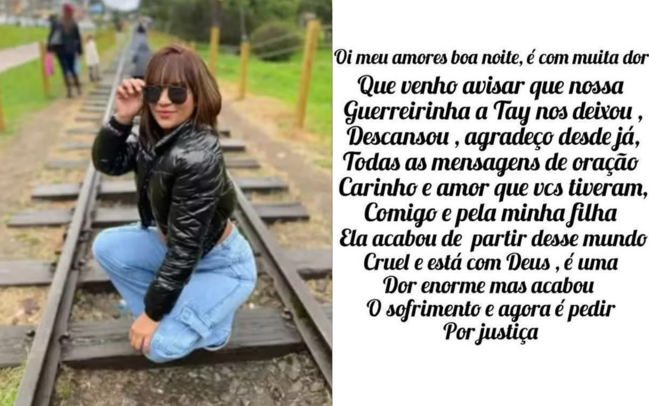 "Oi, meus amores, boa noite. É com muita dor que venho avisar, que nossa guerreirinha Tay nos deixou. Descansou, agradeço desde já todas as mensagens de oração, carinho e amor que vocês tiveram comigo e pela minha filha. Ela acabou de partir desse mundo cruel e está com Deus. É uma dor enorme. Mas acabou o sofrimento e agora é pedir por justiça", disse Lúcia em uma postagem no Instagram. >