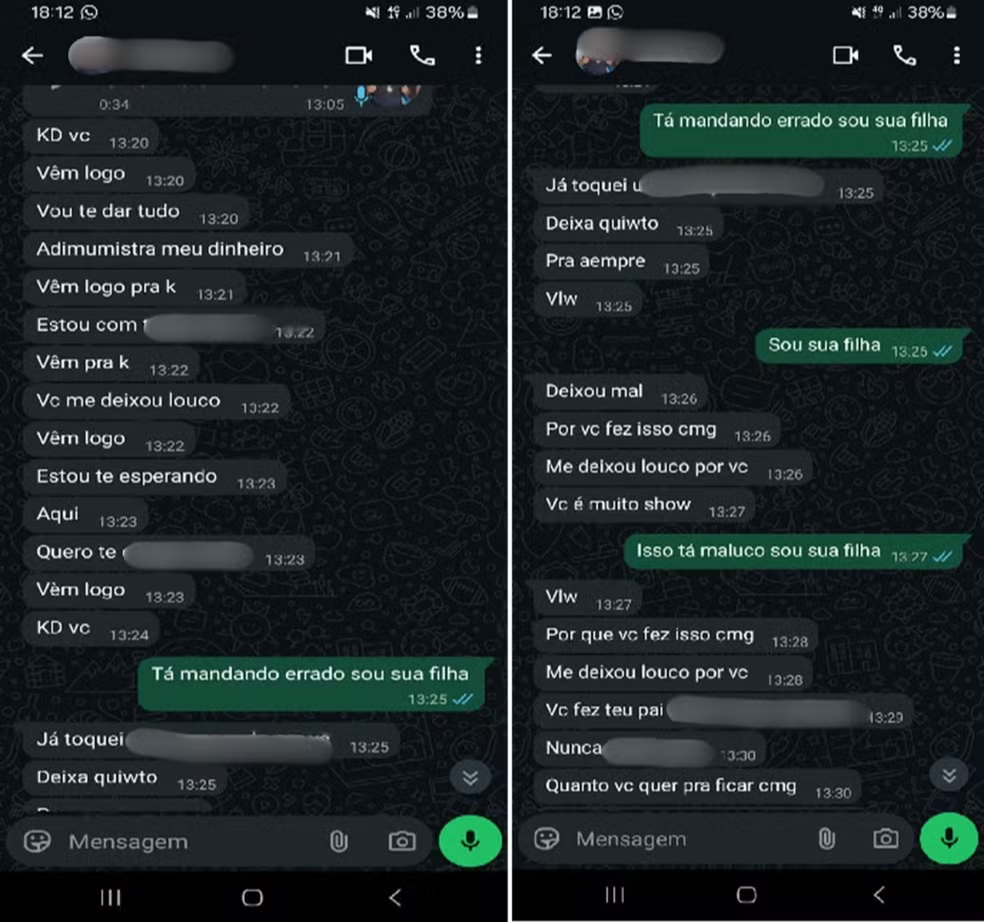 Em mensagens enviadas à filha, o homem faz declarações de cunho íntimo e menciona diretamente o ocorrido. Em um dos trechos, afirma: “Não consegui dormir, só pensando em você” e “você sabe que papai gosta de você”. Em outros áudios, ele chega a perguntar quanto dinheiro ela queria para ficar com ele.>