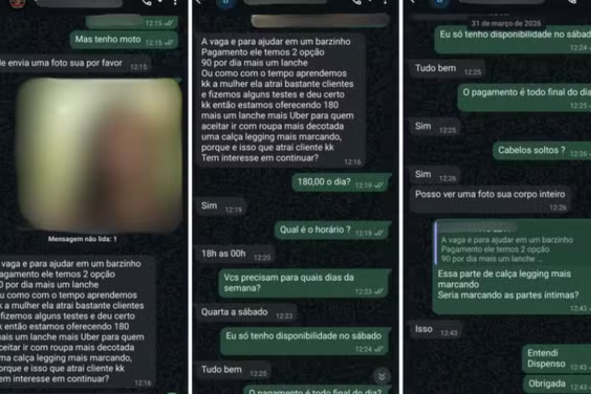 O contato aconteceu depois que a mulher viu o anúncio em um grupo de oportunidades de trabalho no WhatsApp. A oferta indicava vaga fixa, direcionada a mulheres e sem exigência de experiência prévia. Na conversa, o recrutador mencionou pagamento de R$ 90 por seis horas de trabalho, com possibilidade de chegar a R$ 180 caso as condições impostas fossem aceitas. >