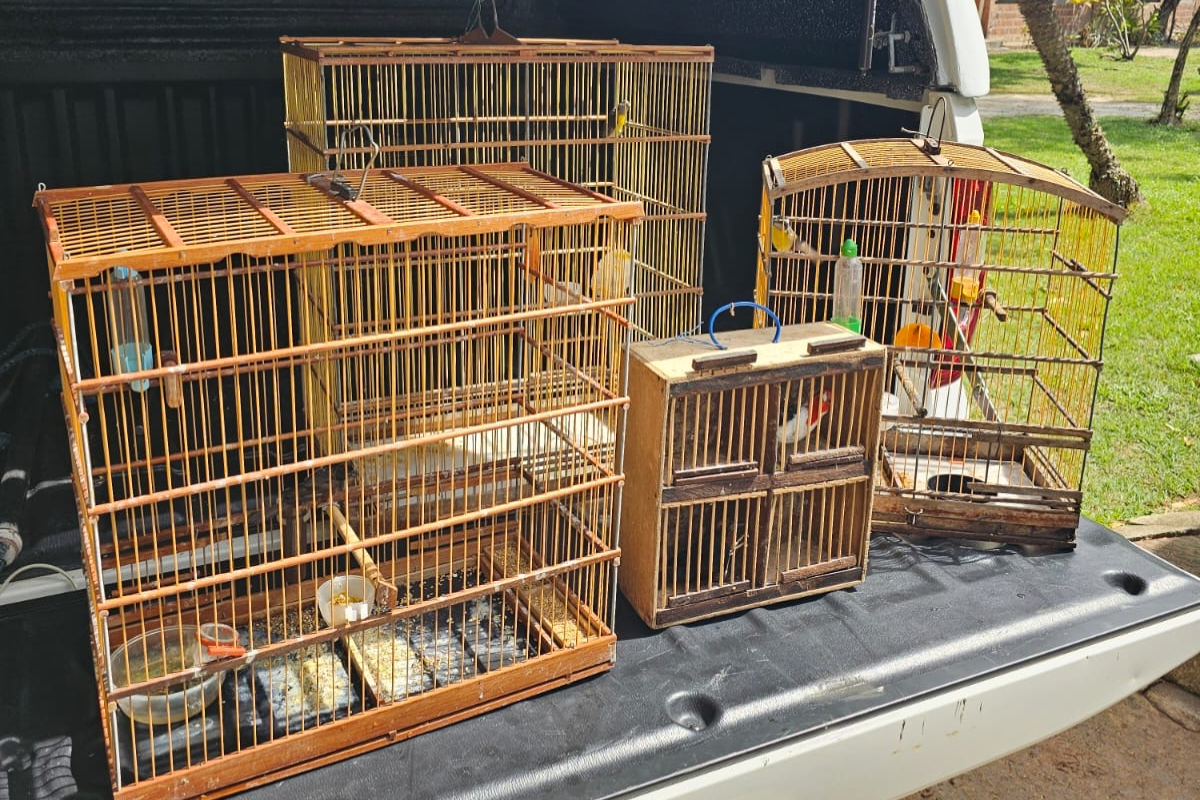 Em uma terceira ação realizada no mesmo dia, mais cinco animais foram apreendidos, totalizando 28 aves retiradas de cativeiro. Em todos os casos, foi constatada a ausência de anilhas e de autorização dos órgãos competentes.>
