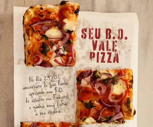 Uma promoção inusitada de uma pizzaria chamou atenção nas redes sociais pela promessa de entregar uma fatia de pizza de graça para clientes que comprovarem, apresentando BO, que foram vítimas de assalto na região. A novidade é da Mooca Pizza Shop, no bairro de Pinheiros, São Paulo, e vai valer para domingo (25), data de aniversário da capital paulista.>
