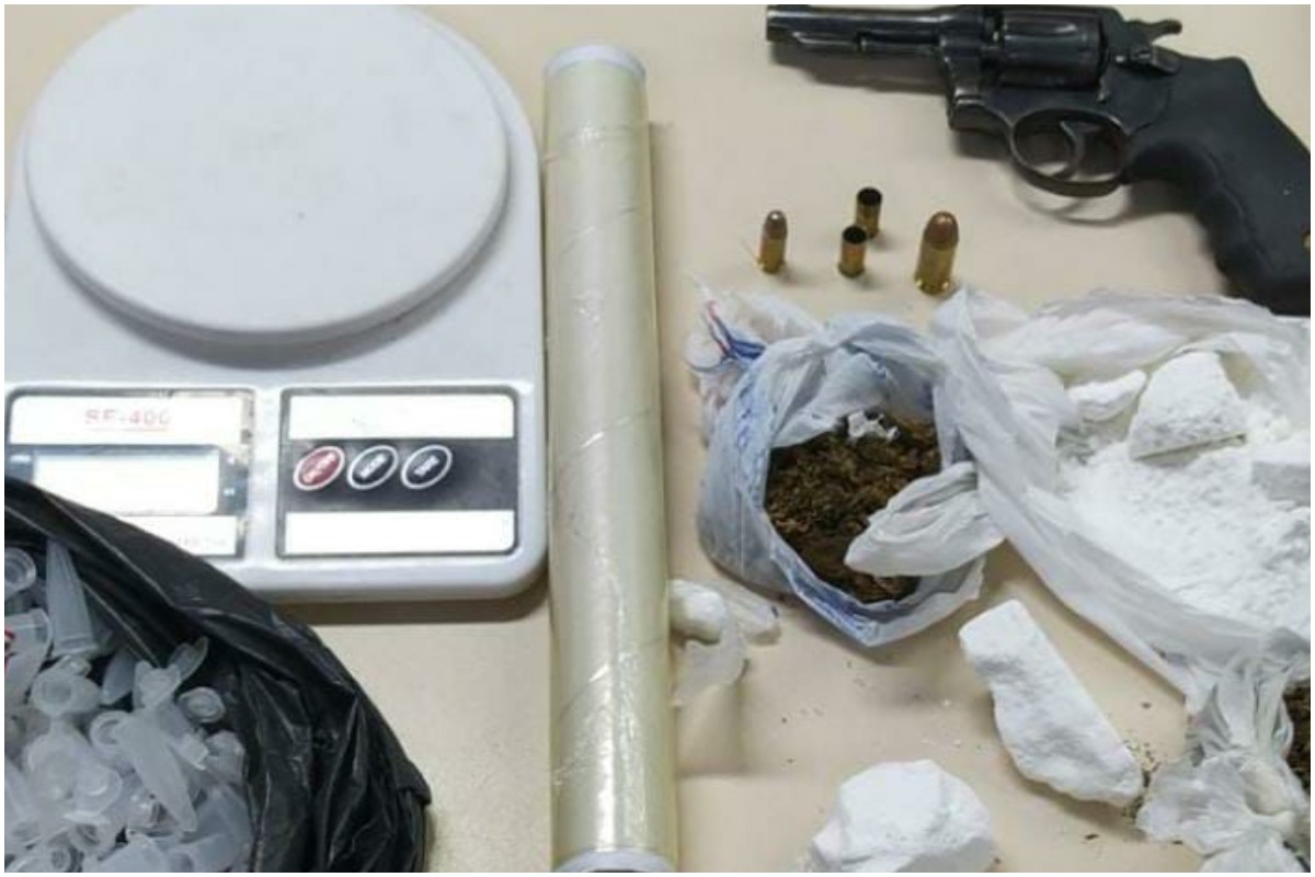 Foram apreendidos um revólver de calibre 32, quatro munições, porções de entorpecentes, duas balanças e diversas embalagens para armazenar drogas. O suspeito e os materiais foram encaminhados para a Central de Flagrante, onde o homem foi autuado por tráfico de drogas e porte ilegal de arma de fogo.>