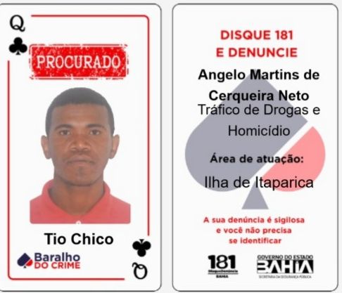 Apontado como um dos principais criminosos do Baralho do Crime, o traficante conhecido como “Rainha de Paus” é considerado o maior nome do tráfico atualmente na Ilha de Itaparica. A carta traz o rosto de Ângelo Martins de Cerqueira Neto, o “Tio Chico”, procurado pela polícia por envolvimento em homicídios.>