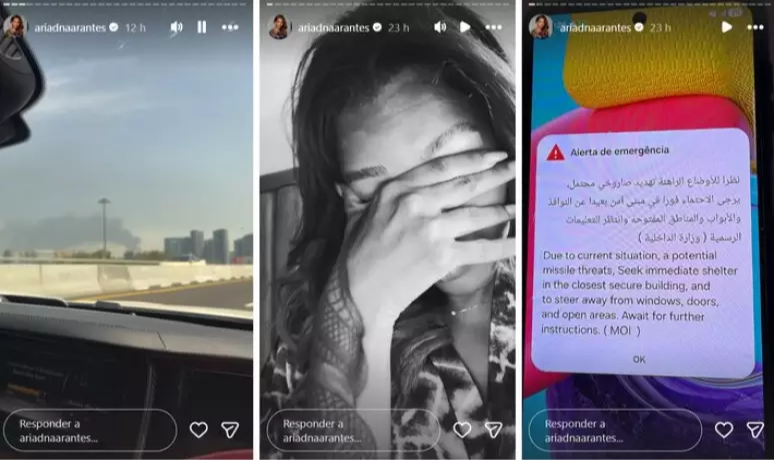 Nos stories, Ariadna mostrou o alerta recebido no celular orientando moradores e turistas a buscarem abrigo imediato e permanecerem longe de janelas e áreas abertas devido à possível ameaça de mísseis.>