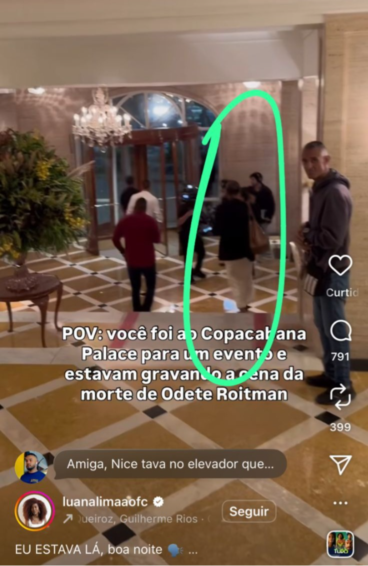 A teoria ganhou força com um vídeo viral de uma influenciadora baiana. Ela registrou a passagem de uma senhora, possivelmente Teca Pereira, enquanto a cena em que César (Cauã Reymond) se dirigia a Olavo para iniciar o plano de assassinato era gravada. As imagens sugerem que a intérprete de Nise estava presente no hotel durante as gravações, reforçando a ideia de que poderia ter participado do crime.>