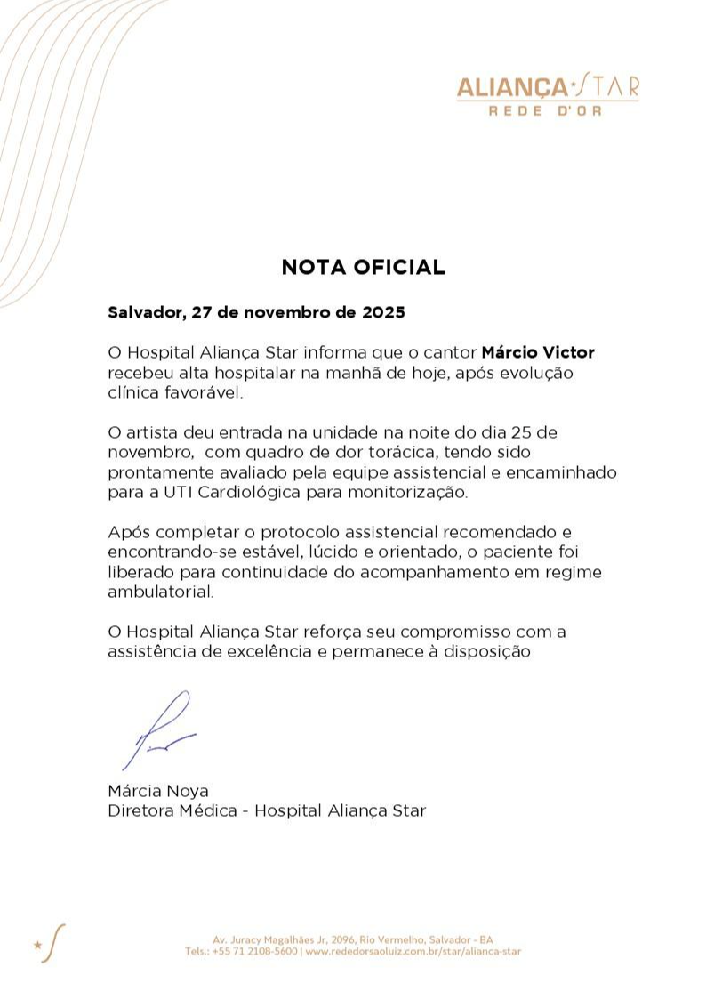 Por conta da internação, todos os compromissos de divulgação que Márcio Victor teria esta semana em São Paulo foram cancelados. A equipe do artista e o hospital reforçaram o pedido de privacidade durante a recuperação e agradeceram as mensagens de apoio enviadas por fãs, amigos e colegas do meio musical.>