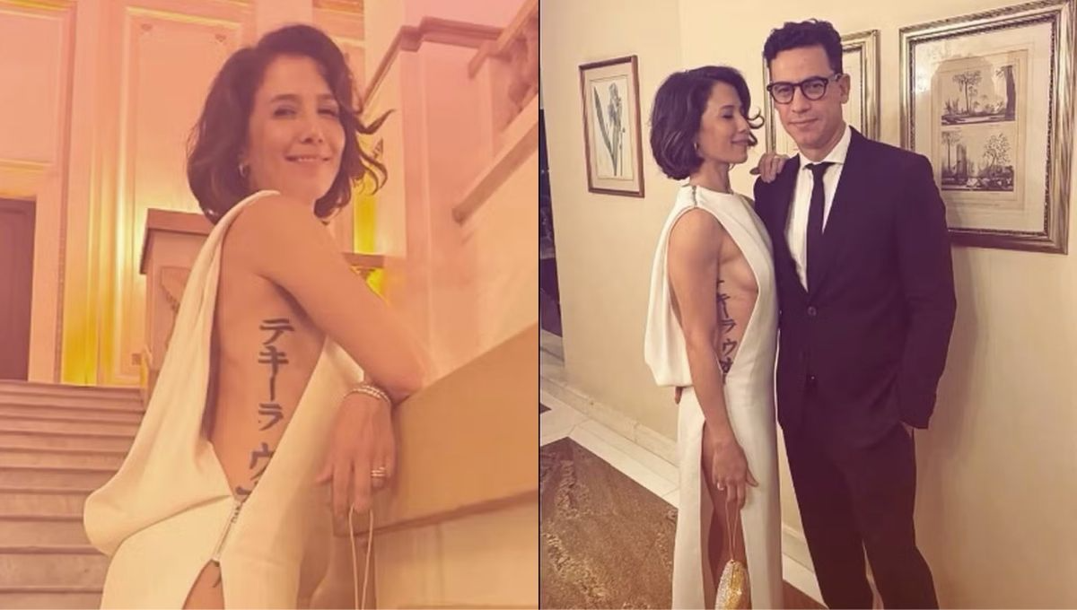 Usando um vestido branco com aberturas laterais, Marjorie deixou à mostra uma tatuagem extensa que vai da região da axila até a coxa. Os escritos em japonês logo viraram assunto entre os seguidores.>