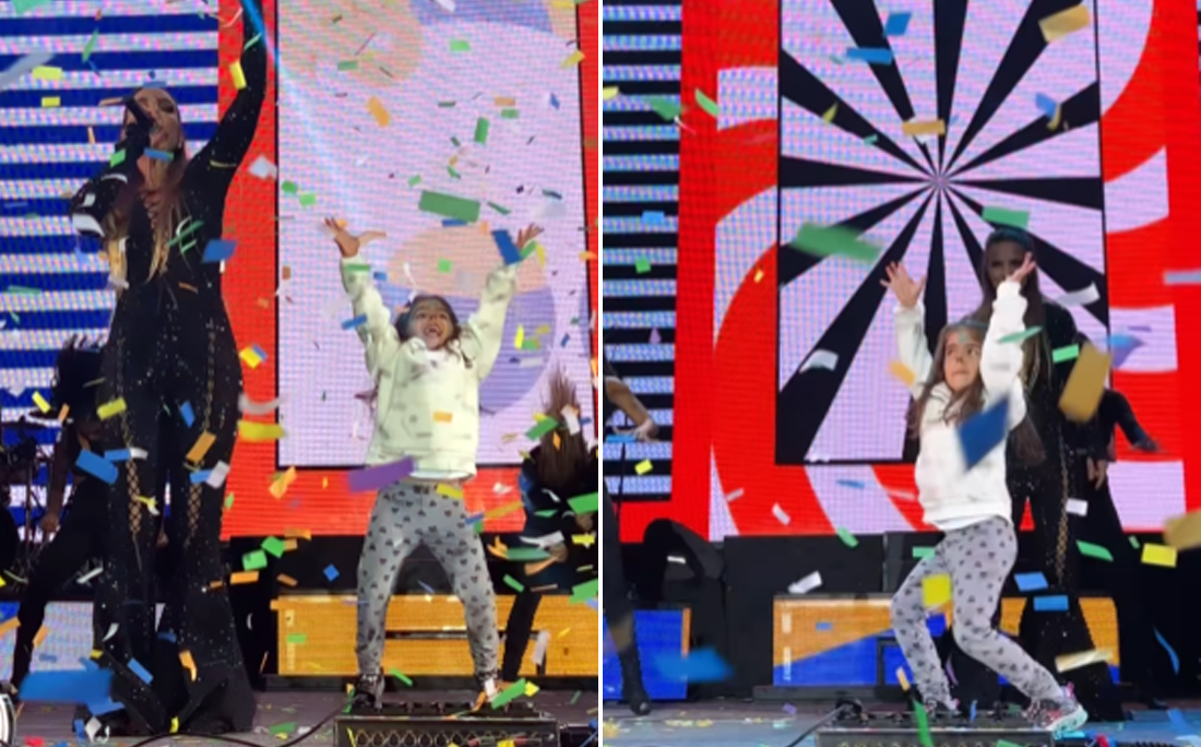Ivete Sangalo recebeu um presente de aniversário especial neste sábado (27), enquanto se apresentava em um show na cidade do Porto, em Portugal. Uma das suas filhas gêmeas, Marina subiu no palco e roubou a cena ao dançar ao som de "Arerê", um dos maiores sucessos da baiana.>