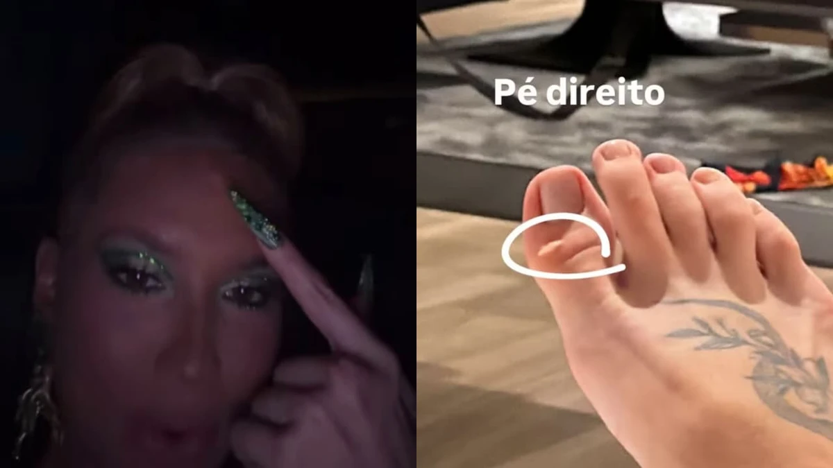 Com bom humor, ela comentou a situação. Disse que estava tão "acabada" que não dava nem para mostrar o rosto direito, preferindo focar na lesão. Além disso, relatou dores nos pés e descobriu machucados que só percebeu ao entrar no banho. Segundo contou, a água caindo sobre um ferimento no pé fez a dor aparecer na hora.>