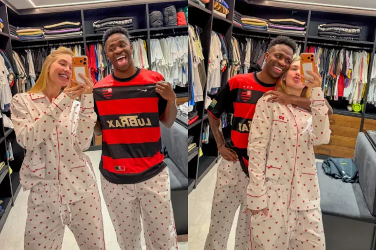 “Ele aceitou vestir pijama combinando, mas com uma condição… A condição: camisa do Flamengo junto”, contou Virginia na legenda. Enquanto ela usava o conjunto completo, o jogador optou por combinar a calça com a camisa do Clube de Regatas do Flamengo.>