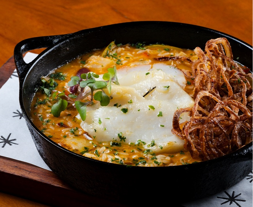 Nem toda mesa precisa surpreender. Algumas precisam apenas funcionar bem. Em A Taberna, no Horto Florestal — o bacalhau aparece em estado de conforto máximo como Arroz Meloso. Cremoso, intenso, cheio de camadas — pimentões, azeitonas azapa, páprica defumada, parmesão e crispy de cebola. É o tipo de prato que não pede análise. Pede repetição.>