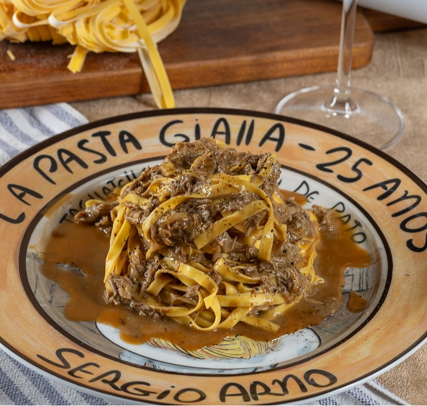 Enquanto os pratos acima ganham o selo comemorativo, o menu especial resgata o Tagliatelle ao Ragù de Pato, prato que acompanha a história do chef Sergio Arno desde os tempos do saudoso restaurante La Vecchia Cucina, em São Paulo, e que se tornou um verdadeiro símbolo de sua gastronomia. Para marcar a data, a massa é servida em um prato de porcelana comemorativo exclusivo, pintado à mão, que o cliente leva para casa como presente, eternizando a experiência e o vínculo com a casa italiana.>