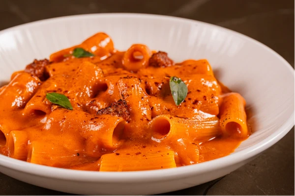 Entre as massas, o rigatoni alla vodka, prato que parece ter voltado à moda nos restaurantes italianos pelas bandas de cá do Atlântico, aposta na intensidade. O molho cremoso de tomate e grana padano ganha protagonismo dos camarões e da induja calabresa. Este último, um embutido apimentado de porco com textura de patê, típico da Calábria e que, segundo o chef, cada família da região tem a sua receita autoral. “A pimenta era a solução para conservar os alimentos das famílias menos abastadas”, afirma. >
