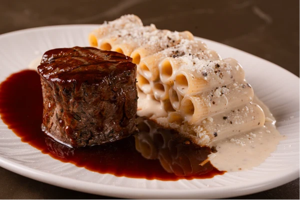 O resultado é um prato vigoroso, saboroso, ainda que mais exuberante do que a simplicidade que consagrou tantas receitas italianas. Vale observar justamente que é quando se aproxima dos clássicos absolutos que o cardápio assume suas maiores licenças. O cacio e pepe, símbolo da cozinha romana em sua forma mais minimalista — massa, pecorino e pimenta — aparece acompanhado de filé mignon e molho demi-glace. A intervenção muda radicalmente o espírito do prato: sai a austeridade romana, entra uma leitura mais rica, quase francesa.>