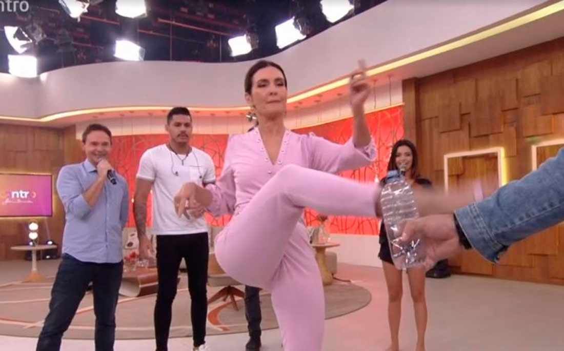 Nesta terça-feira (9), Fátima resolveu encarar o desafio no programa. De salto alto, ela conseguiu de primeira chutar para longe a tampa de uma garrafa vazia. Os convidados e a plateia aplaudiram."Eu faço exercício funcional para isso, para não cair do salto", explicou a apresentadora.>