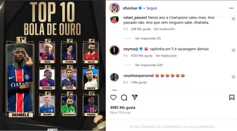 Entre as vozes de protesto esteve Neymar, que usou as redes sociais para criticar a posição do compatriota. Em comentário no Instagram, em uma publicação que mostrava o top-10 da premiação, o camisa 10 escreveu: “Raphinha em 5º é sacanagem demais”.>