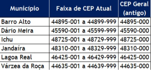 Os Correios finalizaram a implementação da codificação postal específica para as cidades baianas de Barro Alto, Dário Meira, Ichu, Jandaíra, Lagoa Real e Várzea da Roça. Com essa atualização, cada logradouro dessas localidades, incluindo ruas, avenidas, praças e travessas, passa a contar com um Código de Endereçamento Postal (CEP) individualizado, em vez de um código único para todo o município. >