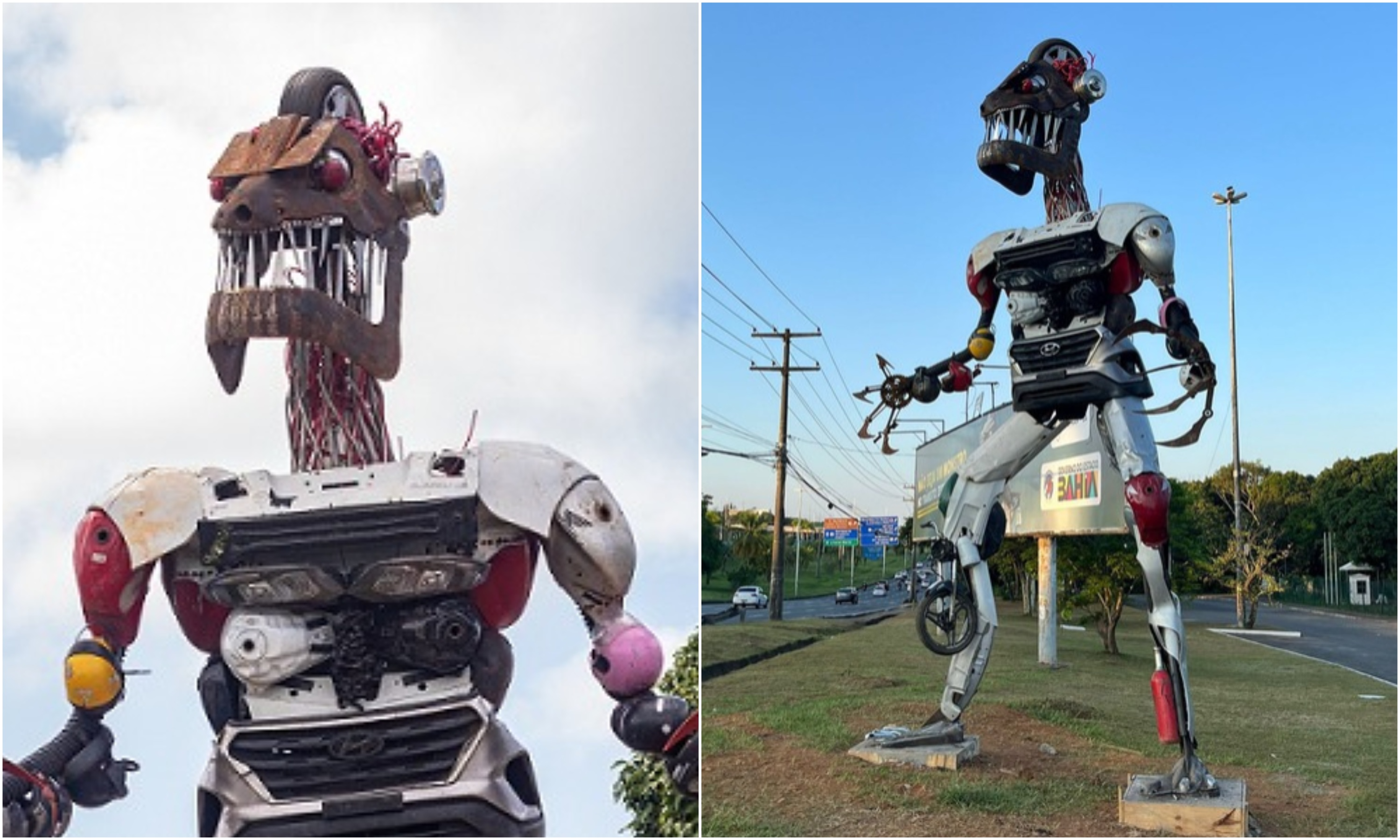 Com seis metros e produzida com peças de veículos batidos, a criatura chama atenção dos motoristas."Não provoque mortes, não cause dor, não seja um monstro no trânsito, escolha a vida" é a mensagem que fica no outdoor ao lado da escultura.>