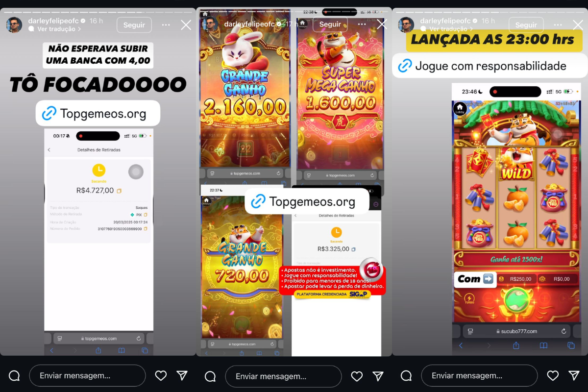 Festas e camarotes no carnaval também fazem parte da rotina de luxo do influencer. Entre as fotos e vídeos de viagens e conteúdos em tom humorístico, Darley compartilha propaganda para diferentes jogos de apostas online em seus stories. Em um deles, o influenciador chega a mostrar ao seguidores um comprovante de saque no valor de R$ 4.727,00.>