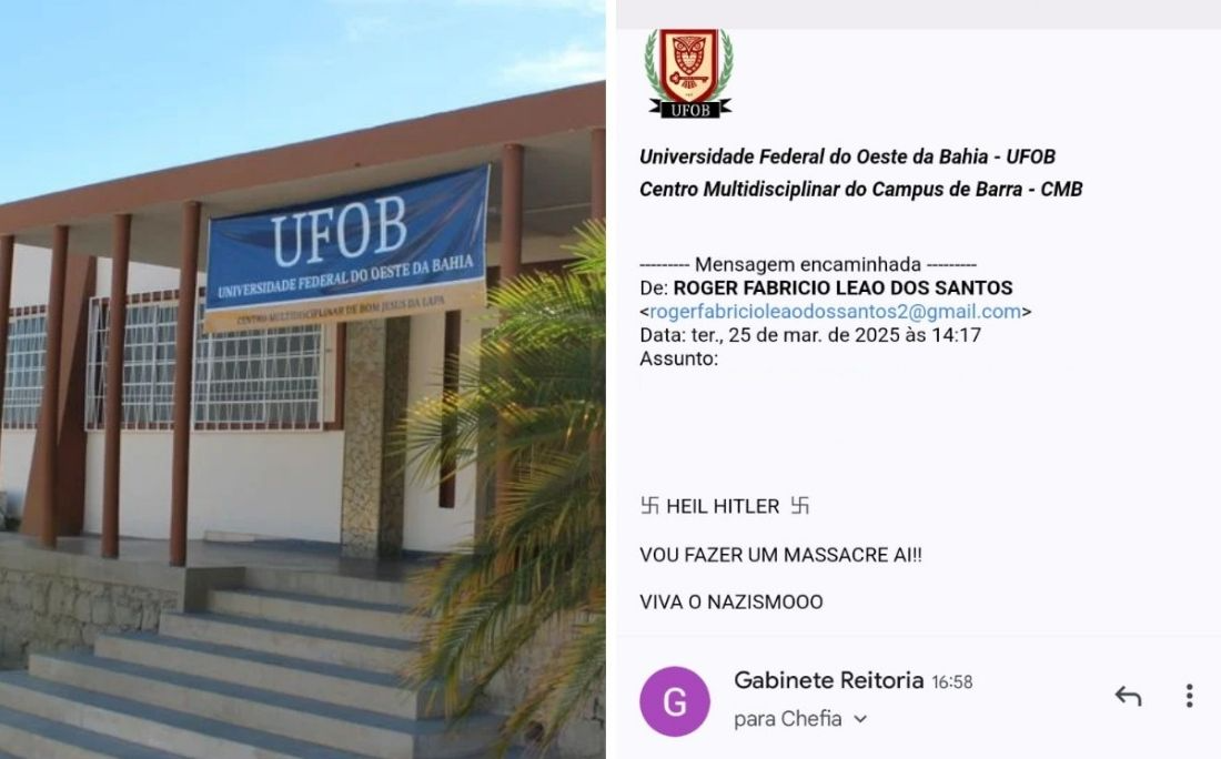 "Heil Hitler. Vou fazer um massacre aí. Viva o nazismo", diz um dos e-mails enviados pelo homem investigado pela Polícia Federal (PF) por ameaçar atacar universidades federais. As mensagens, com conteúdo de apologia ao nazismo, foram encaminhadas a diversas instituições de ensino, incluindo três na Bahia: a Universidade Federal da Bahia (Ufba), a Universidade Federal do Recôncavo da Bahia (UFRB) e a Universidade Federal do Oeste da Bahia (Ufob). >