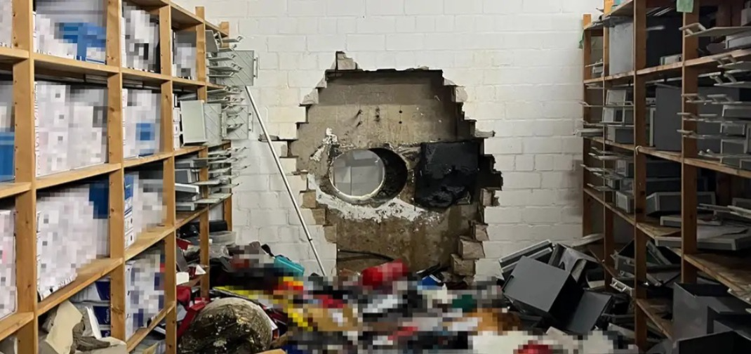 Uma foto divulgada pela polícia mostra arquivos espalhados pelo chão e um buraco circular na parede que dava acesso ao cofre, disse a RFI.>