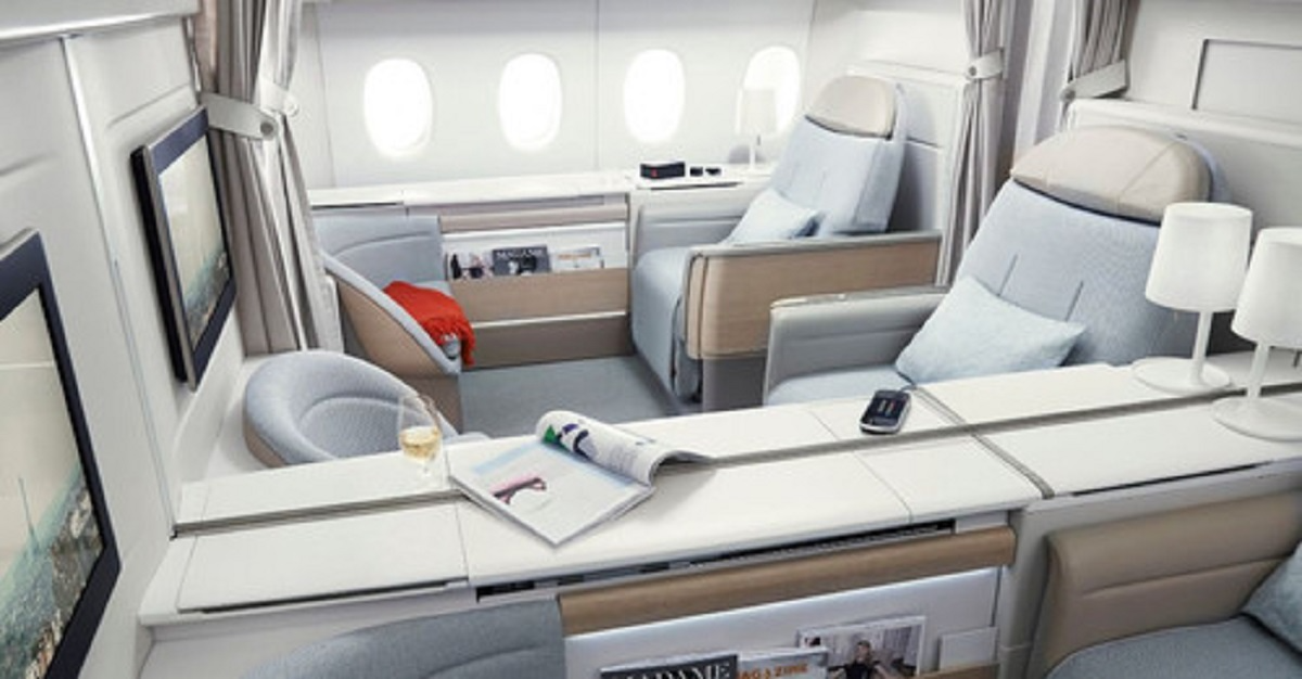 Entre os benefícios para quem viaja na La Première estão luxos como a opção de privatização completa da cabine; carro privativo para sair e voltar do aeroporto Charles de Gaulle (CDG), em Paris; lounge exclusivo com área de check-in, controle de passaporte e menu assinado por Alain Ducasse, no CDG; carro à disposição para transporte do lounge à porta da aeronave; e um comissário para acompanhamento durante toda a viagem a bordo.>