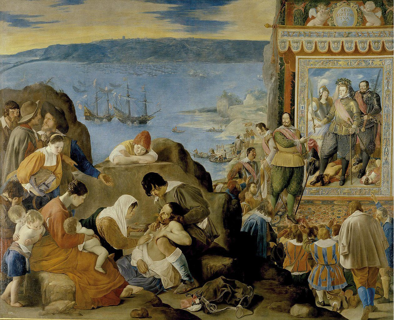 A “Reconquista da Baía”, também chamada de restituição e até de restauração por alguns autores, foi um dos eventos militares mais divulgados do século XVII, contado literalmente em verso, prosa e tinta. Os espanhóis viam no feito a oportunidade de enaltecer o imperador Felipe IV, apresentado como “o grande rei católico das Espanhas e das Índias”. Foi tão importante que 1625 entrou para a história como o “Annum Mirabilis” – o ano maravilhoso. O quadro de Maina, por outro lado, põe em destaque as vítimas da guerra, o que levaria inclusive a analogias posteriores com o Guernica de Picasso. >