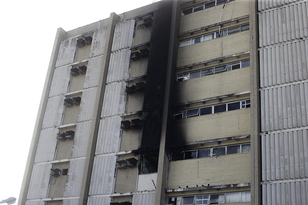 No interior do prédio, que pegou fogo no domingo (9), o cenário chega a lembrar um filme de terror. O teto cedeu, fios ficam expostos no chão, estilhaços de vidro em todo canto, portas arrancadas e dezenas de equipamentos amontoados são alguns dos detalhes que mais chamam a atenção.>