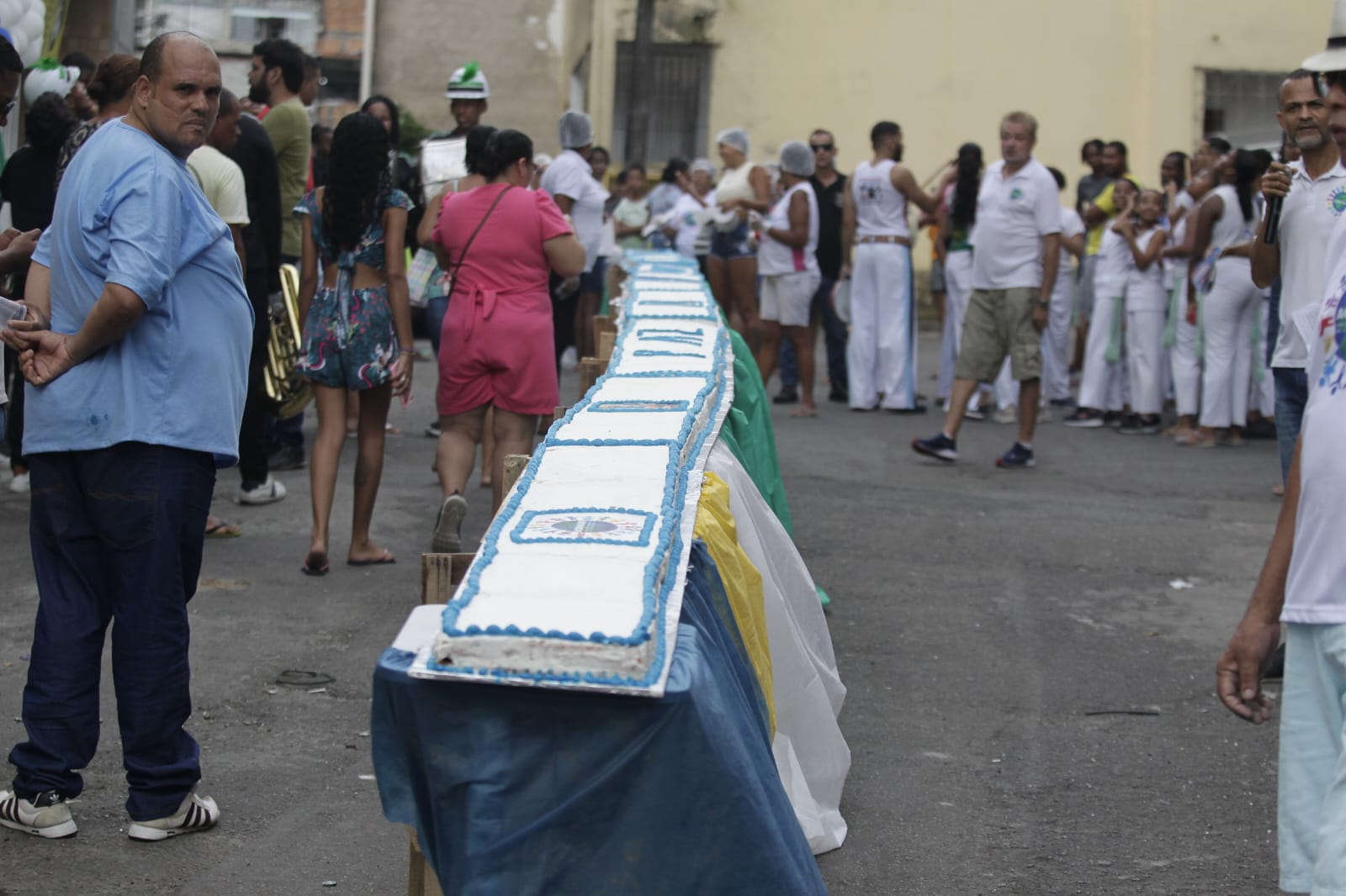 A organização do evento é feita pelos moradores que integram a Associação Comunitária e Beneficente de Vila Tiradentes Goméia e Roma, que liderou as lutas pelas obras de melhoria no bairro. Segundo o seu presidente, Joaquim dos Santos Junior, o doce é símbolo do movimento. “O bolo de 21 metros é a gente ter vivo o espírito de mobilização da comunidade, para lutar e conseguir a benfeitoria", descreveu. Grupo de capoeira se apresenta na festa de Tiradentes (Foto: Arisson Marinho/ CORREIO) Além do bolo, a festa conta com atrações culturais como a fanfarra do Colégio Estadual Desembargador Pedro Ribeiro, apresentações de karatê, boxe, capoeira e futmesa com alguns nomes de destaques nas modalidades.>