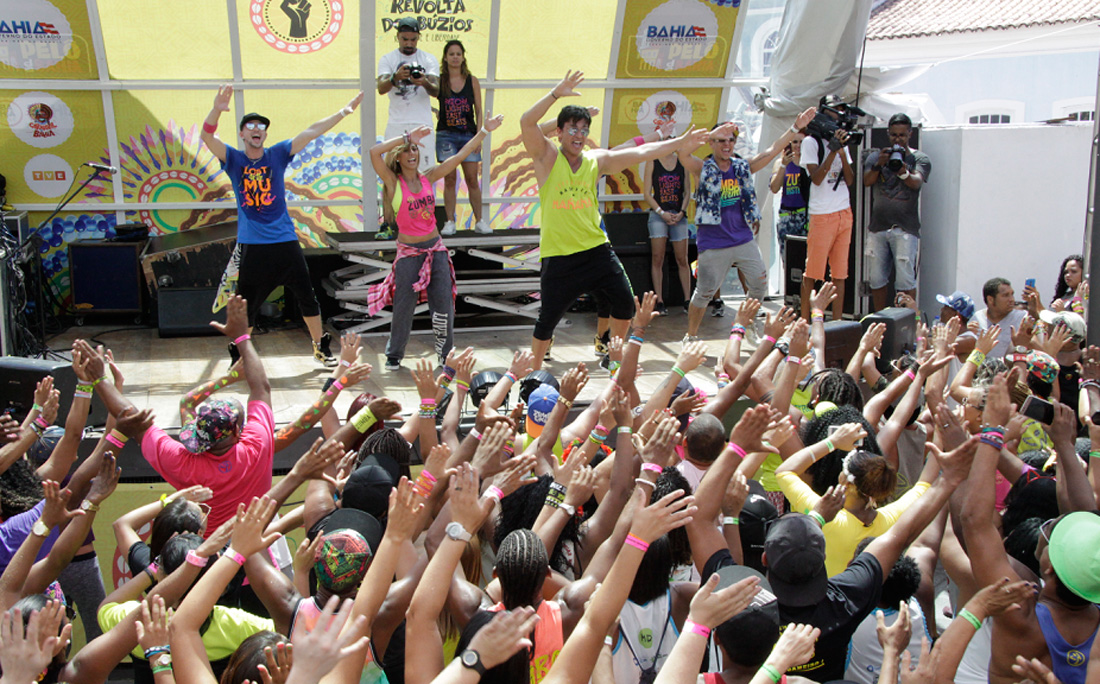 “Isso aqui é melhor do que qualquer academia. A gente queima calorias num clima de Carnaval”, disse a psicóloga Ana Maria Costa, 34 anos, enquanto remexia o quadril em sincronia com a multidão na Praça Tereza Batista, no Pelourinho, na manhã deste sábado (10). Ela e outras 100 pessoas praticavam um exercício aeróbico com ritmos de dança latina, como a salsa, merengue, mambo, reggaeton, e brasilidades como o samba, axé e funk. O que é isso? Zumba.>