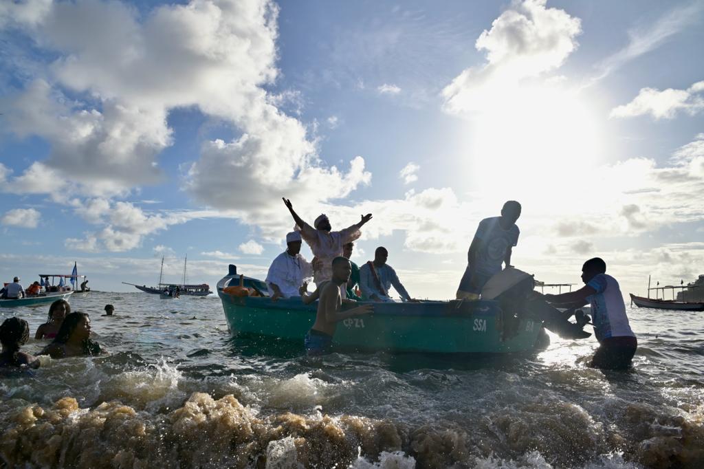 Pescador no Rio Vermelho, Jair, conhecido como Vovô, diz que a data é de agradecimento. ”Hoje em dia está bom [o trabalho], dá para a gente viver bem da pesca. A festa também dá bons resultados para levar o pessoal no cortejo marítimo [quando os presentes são entregues ao mar]”, afirma. Pescadores e devotos acompanham presentes de Iemanjá Foto: Paula Froes / CORREIO Os marinheiros contam que a tradição começou quando o mar estava sem peixe e os pescadores, sem sustento. Ao orar por prosperidade, para Iemanjá, e jogar a rede, um milagre aconteceu. Os homens conseguiram pegar peixes para alimentar todos da colônia e ainda vender. Desde então, a festa se sucedeu e não faltou peixe no mar. >