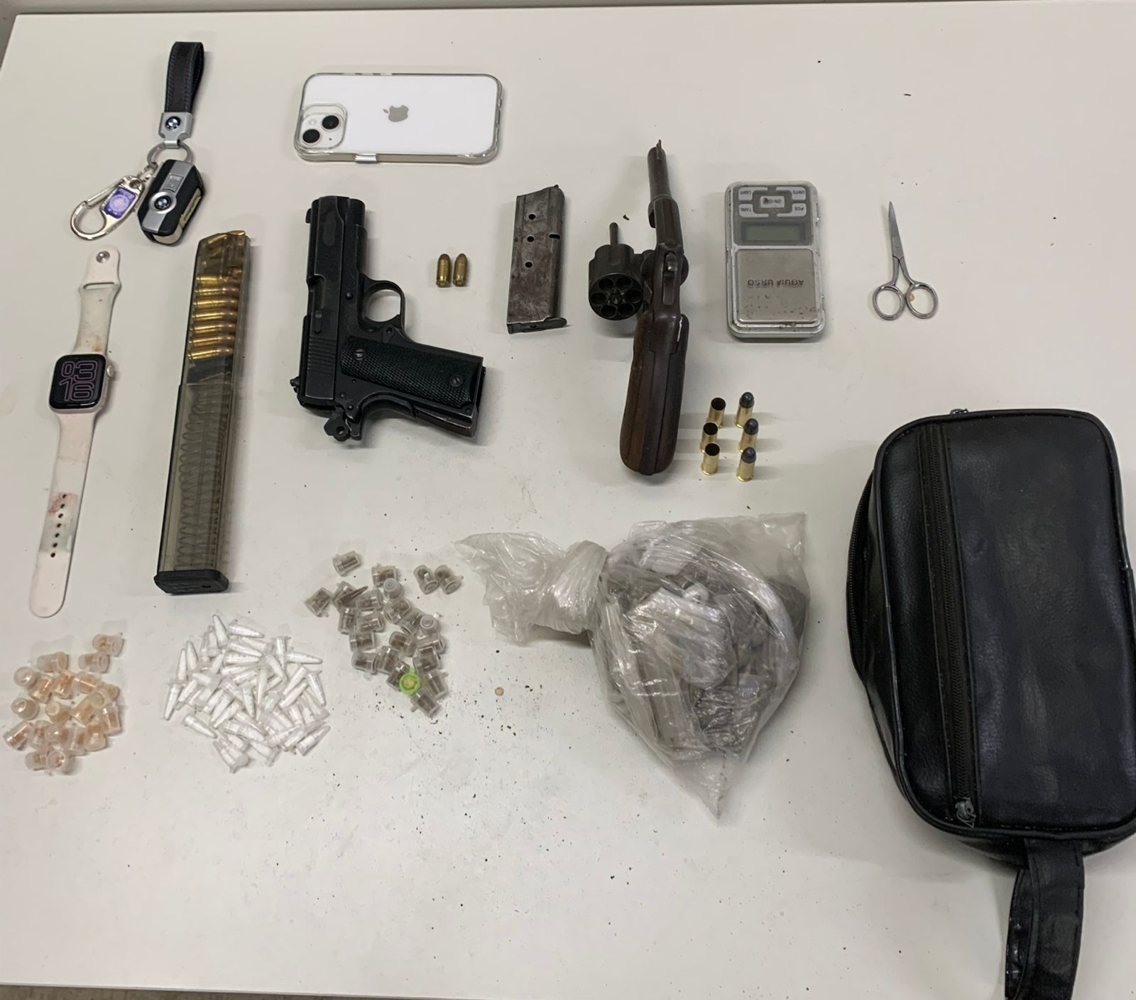 Após o fim dos disparos, os militares fizeram uma varredura no local e encontraram diversos materiais, incluindo um carregador de submetralhadora calibre 9 mm, munições, 126 pinos de cocaína, 45 porções de crack, 13 porções de maconha, além de um rádio comunicador, uma balança de precisão e uma motocicleta.>