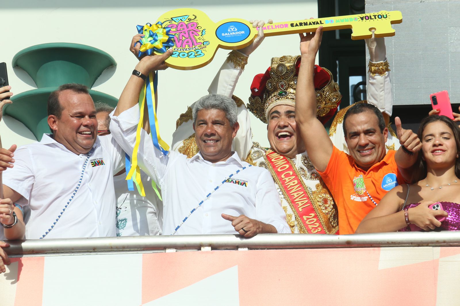 O prefeito de Salvador, Bruno Reis (União Brasil), acaba de entregar a chave da cidade ao Rei Momo, Alan Nery, em uma cerimônia no Camarote 2222 em frente ao Farol da Barra. A partir de agora entramos oficialmente no Carnaval de 2023. Nos próximos sete dias, cerca de mil atrações, 600 delas nos três circuitos oficiais e 400 nos carnavais nos bairros, vão oferecer 2.600 horas de música ao longo da folia. O governador Jerônimo Rodrigues também participou da cerimônia.>