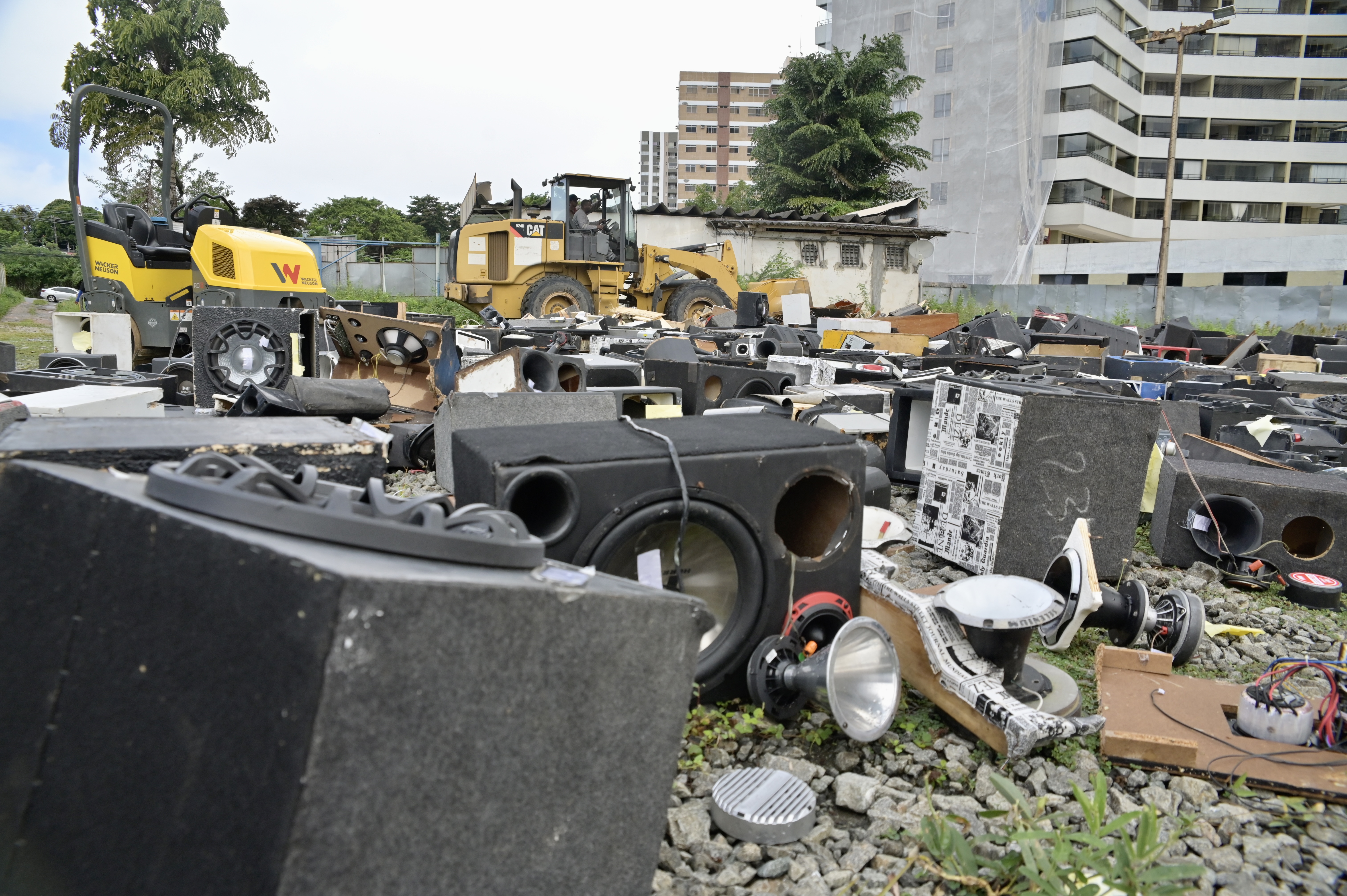 Caixas de som, sons automotivos e paredões foram alguns dos equipamentos comprimidos pela máquina. Os paredões, que consistem em conjuntos de caixas de som empilhadas, são os aparelhos mais potentes entre os apreendidos, diz Cardim. >