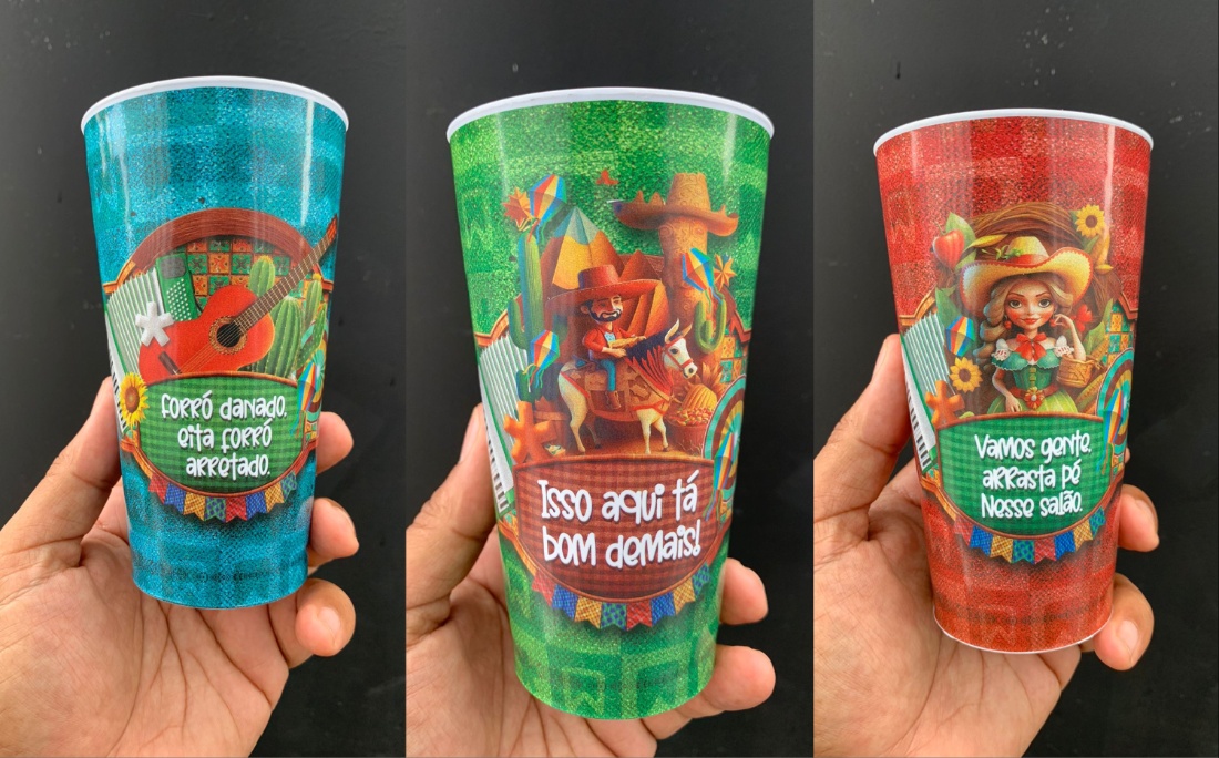Disponível em três versões e diferentes cores — verde, azul e vermelho —, o produto traz, estampados, trechos de músicas de forró eternizadas pelas vozes de Dominguinhos e Luiz Gonzaga: 'Isso Aqui Tá Bom Demais'; 'Forró Arretado'; e 'São João Na Roça', respectivamente.>
